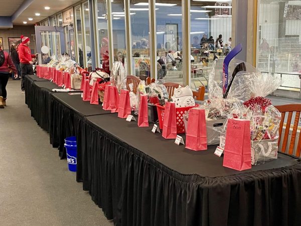 In the rink lobby, tables displayed signed memorabilia for silent auction, a 50/50, and raffle baskets donated by families of the players, BeeGraphix, the Mighty Penguins, and others affiliated with the teams. Members of the Student Activities Board sold limited-edition Vulcan Nation hockey shirts and sweatshirts in the lobby as well as sponsoring a shuttle bus to the event.